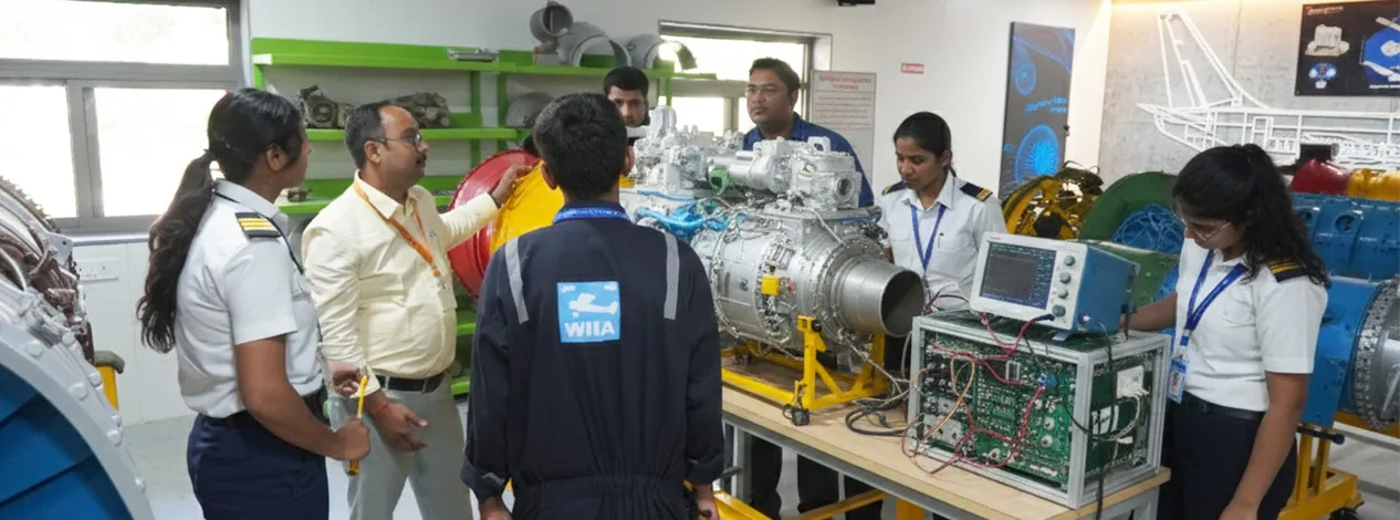 WIIA provides 70% of practical training on campus in specialized labs (aerodynamics, propulsion) and on live aircraft like the Boeing 737-200. The remaining 30% is conducted in a real-world working environment at a DGCA-approved CAR 145 AMO.